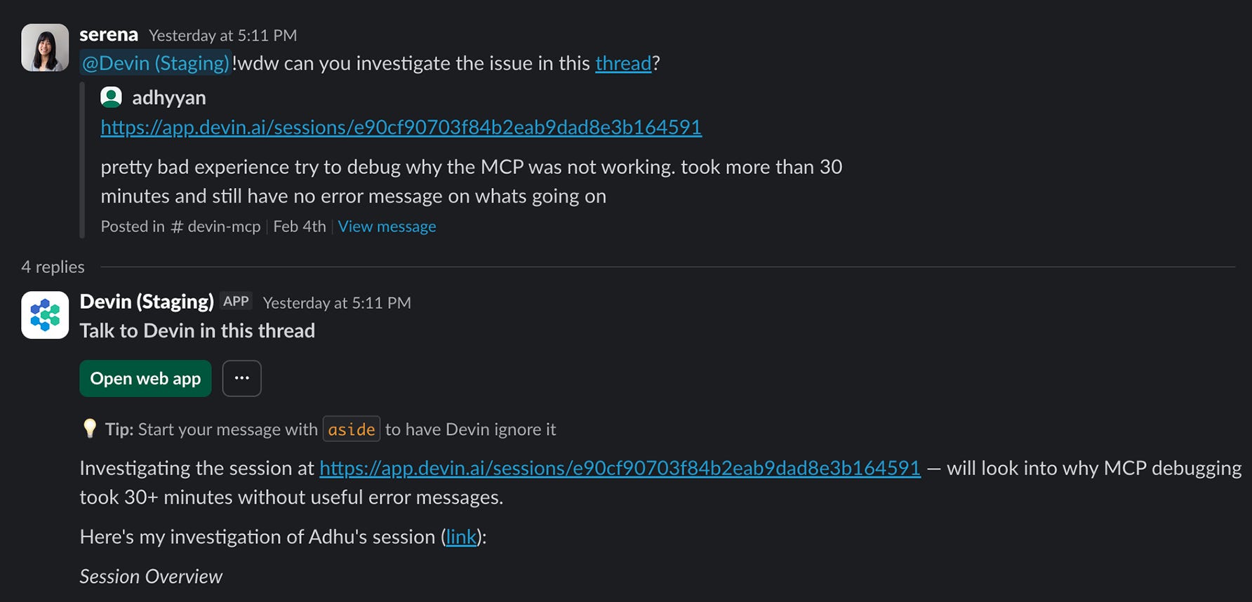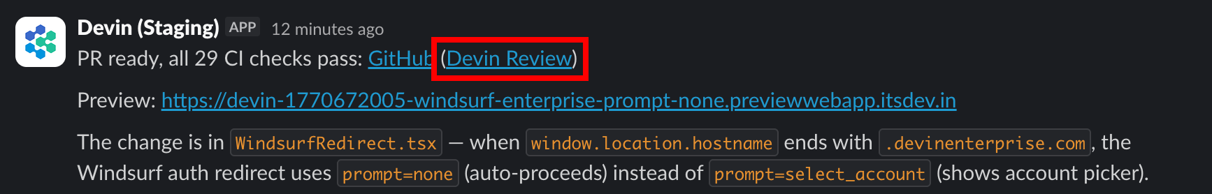 Every time Devin posts a PR in Slack, it includes a Devin Review link, so the organized diff is always one click away.