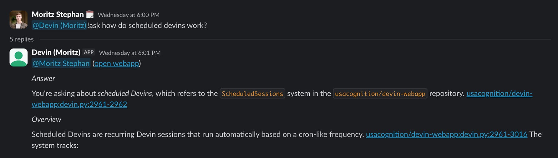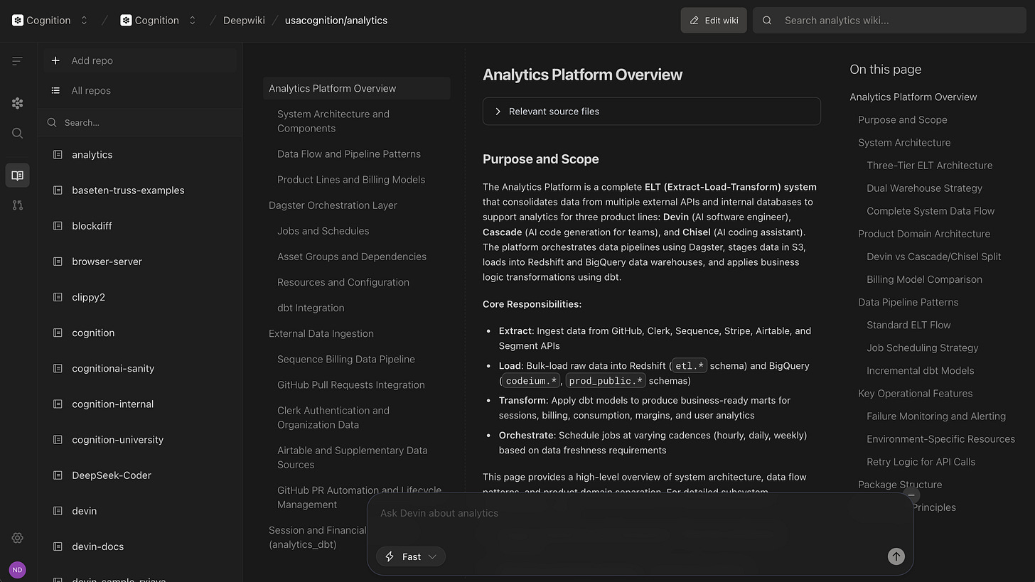 We use it to get up to speed on unfamiliar parts of the codebase. Ask Devin uses information in the Wiki to better understand and find relevant context.