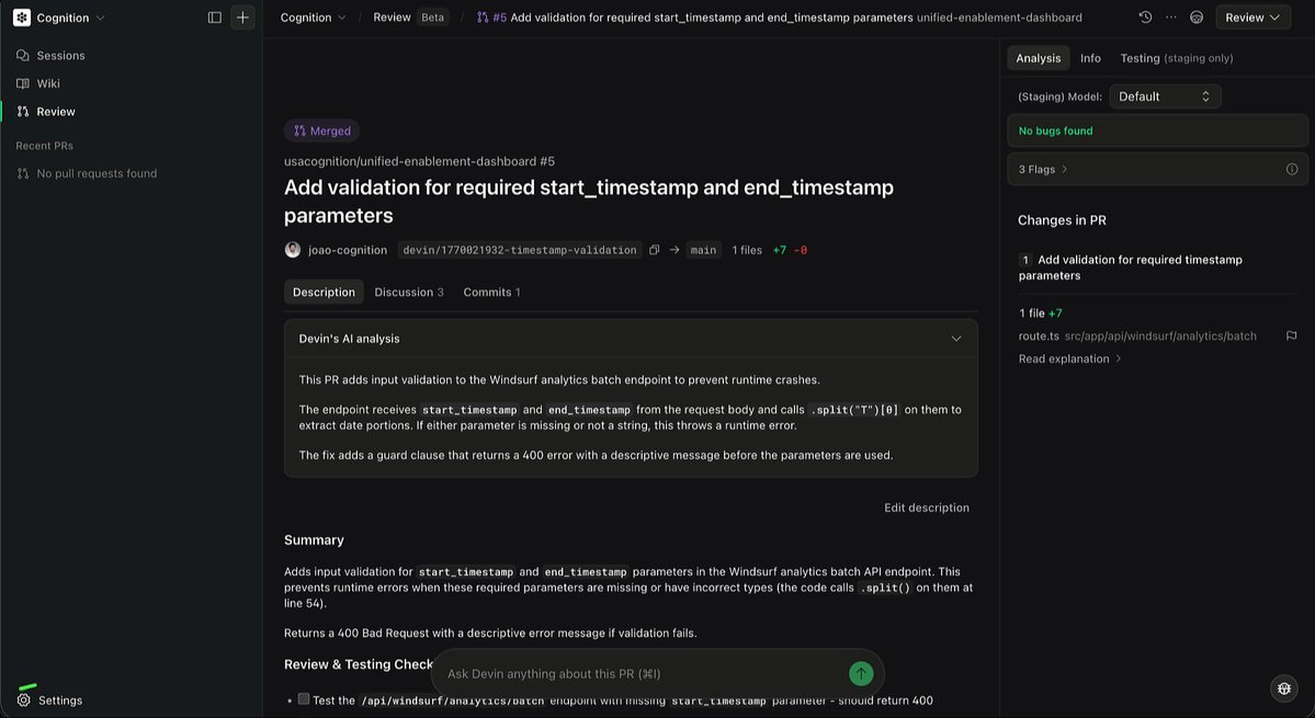 Once Auto-Review is configured, Devin starts automatically reviewing PRs when they’re opened, when new commits are pushed, or when someone is added as a reviewer.