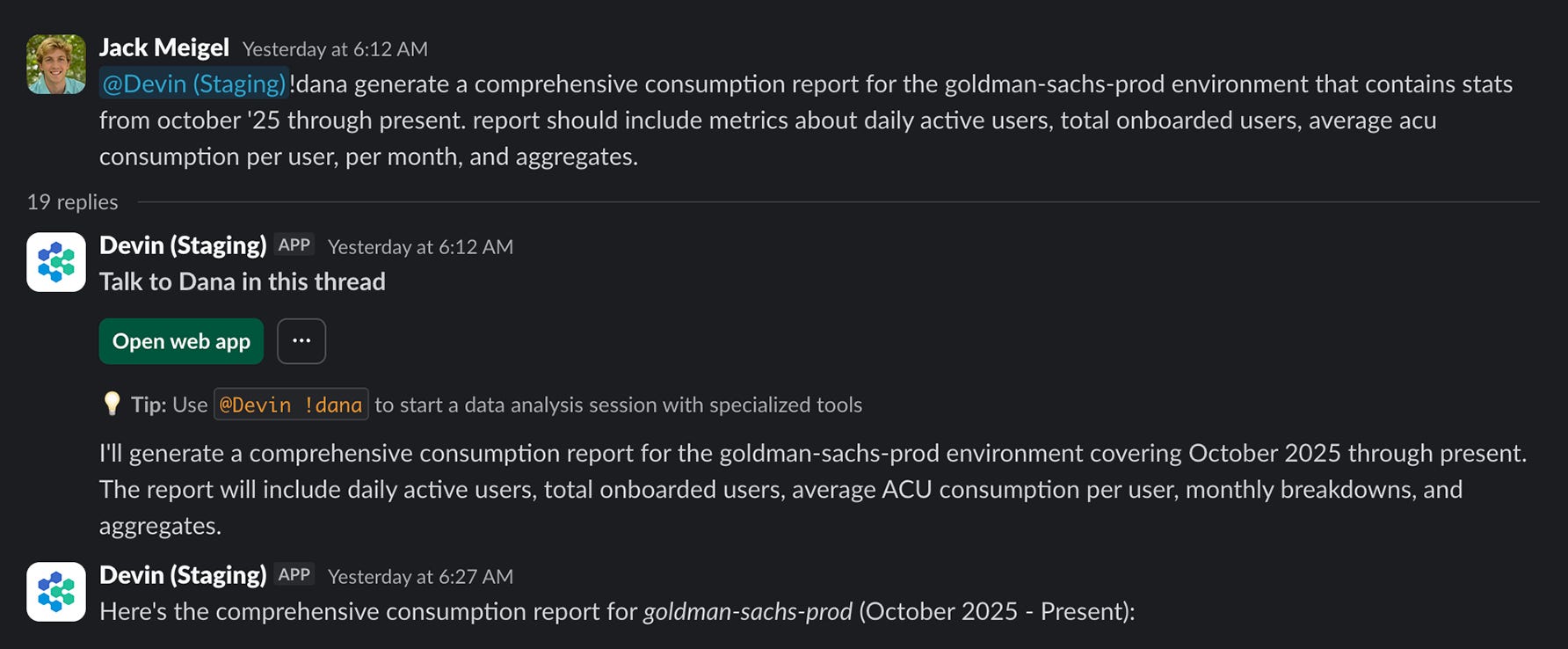 We’re able to access DANA from the web app by clicking the agent picker dropdown, or from Slack using /dana or @Devin !dana followed by our question.